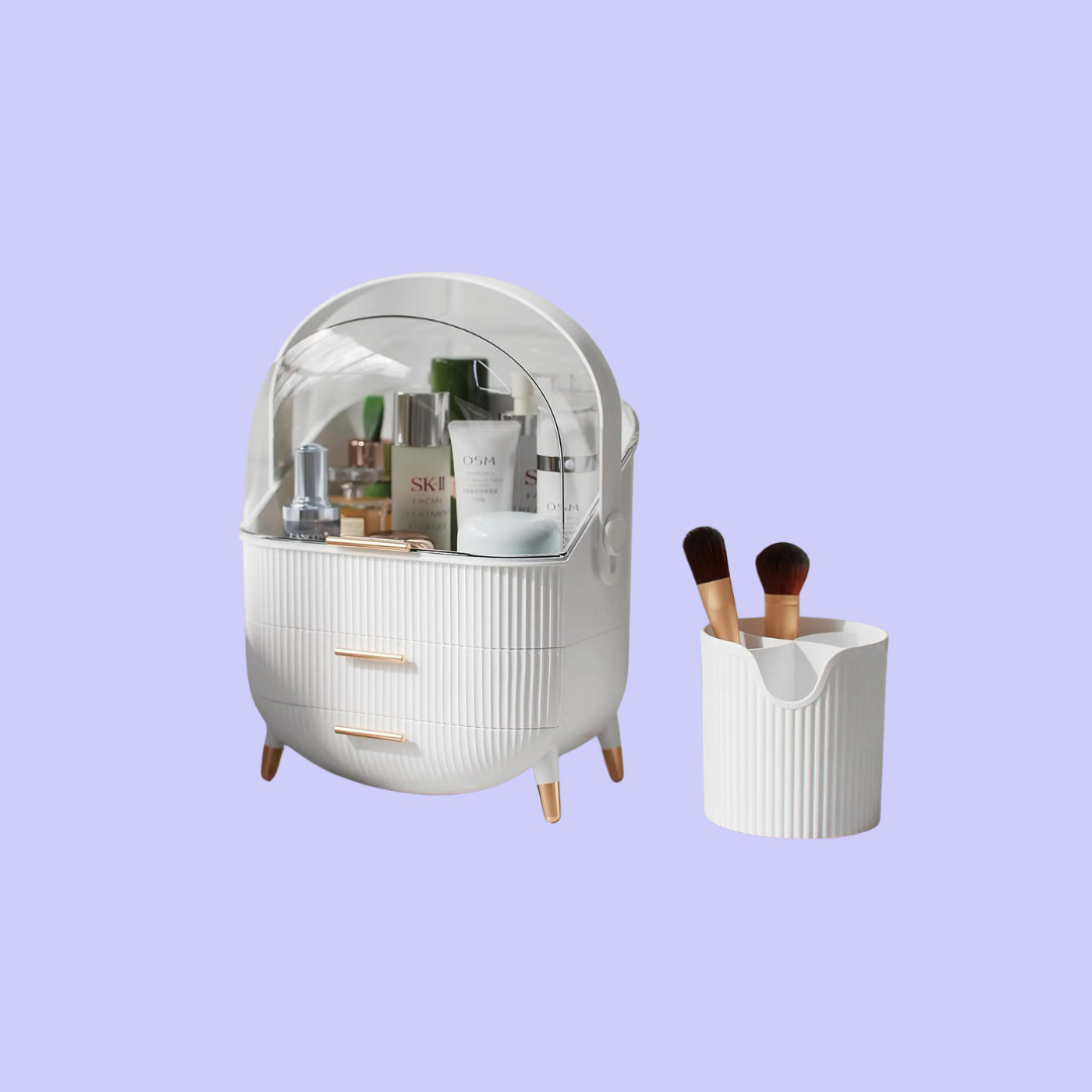 סט ארגוניות איפור לחדר כולל סדרת תאים ומגירות שמיועדות לאחסון מסודר של מוצרי איפור, תכשירים, אביזרי טיפוח ופריטים נוספים. ליד הארגונית הגדולה תקבלי ארגונית למברשות.